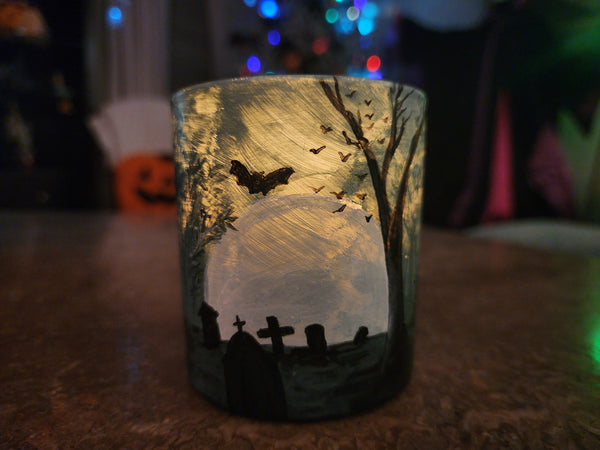 "Look at your hand painted candle in action! It's even prettier lit up. I knew this one was mine the minute I saw it. The moonlit cemetery, deep within the eerie woods.... Yep, snatched that one up before anyone else did!"